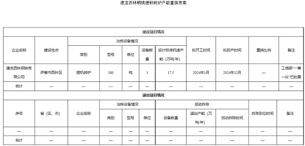 黑龍江工信廳:建龍西林提釩轉(zhuǎn)爐產(chǎn)能置換方案公示