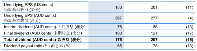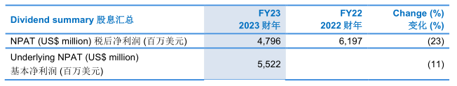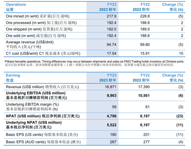 •包括每股 0.75 澳元的中期股息,2023 財(cái)年宣布的總股息為每股 1.75 澳元,派息率為 2023 財(cái)年基本稅后凈利潤(rùn)的 65%。 這與 Fortescue 所陳述的努力實(shí)現(xiàn)全年基本稅后凈利潤(rùn) 50%至 80%的派息政策相一致。
