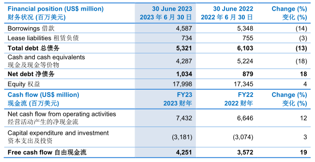 •Fortescue 的資產(chǎn)負(fù)債表保持強(qiáng)勁,截至 2023 年 6 月 30 日的現(xiàn)金余額為 43 億美元,債務(wù)總額為 53億美元,因而凈債務(wù)為 10 億美元。