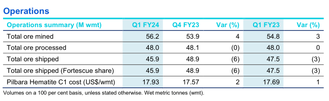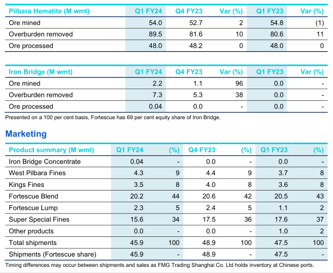 其他方面:2024財年第一季度開采的礦石總量為5620萬噸,同比增長3%,因為Iron Bridge磁鐵礦項目在該季度已開始運營。