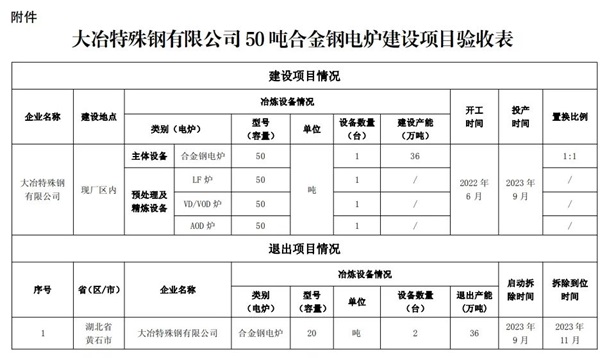 大冶特殊鋼有限公司依據(jù)省經(jīng)信廳〔2021〕年第8號公告的50噸合金鋼電爐產(chǎn)能置換項目已建成。用于置換的2臺20噸電爐已按規(guī)定完成拆除,通過省級驗收;新建項目經(jīng)第三方機構(gòu)(冶金工程咨詢甲級資質(zhì))評估公稱容量為50噸,與公告方案一致。