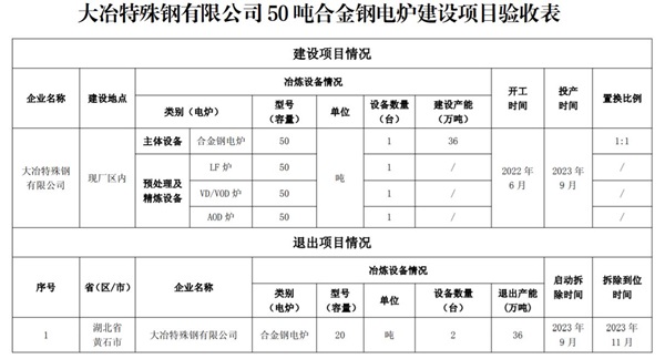 湖北經(jīng)信廳:大冶特殊鋼50噸合金鋼電爐產(chǎn)能置換項(xiàng)目驗(yàn)收公告