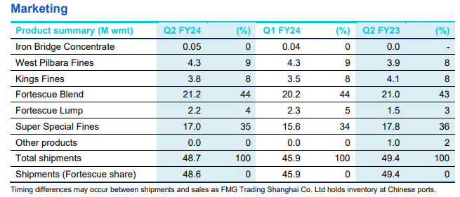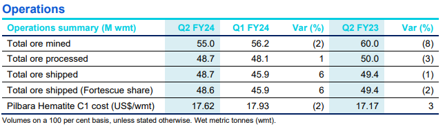 指導方面:2024財年(2023年7月-2024年6月)鐵礦石指導發(fā)運量維持在1.92-1.97億噸(其中,Iron Bridge磁鐵礦項目預期發(fā)運量在200-400萬噸)。2024財年指導C1現(xiàn)金成本在18-19美元/濕噸區(qū)間內(基于假定的澳元平均匯率: 0.68美元)。