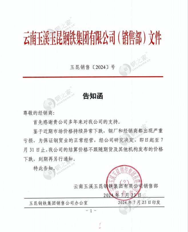 鑒于近期市場價(jià)格持續(xù)異常下跌,云南區(qū)域鋼廠和經(jīng)銷商都出現(xiàn)嚴(yán)重虧損,為保證鋼貿(mào)業(yè)的正常經(jīng)營,經(jīng)云南各鋼廠銷售公司研究決定,即日起至7月31日,各鋼廠結(jié)算價(jià)格不跟隨期貨及其他機(jī)構(gòu)發(fā)布的價(jià)格下跌,到期再另行通知。