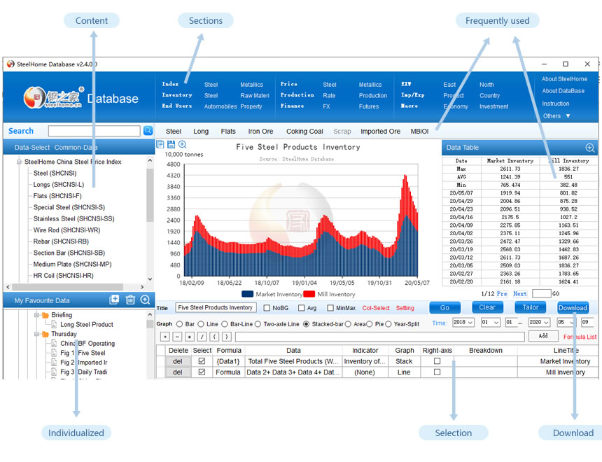 The Database mainly covers 9 sections, including Price Index, Market Price, Ex-works Price, Market Inventory, Production & Consumption, Import & Export, Macro Data, Steel-consuming Sectors, Financial Figures.