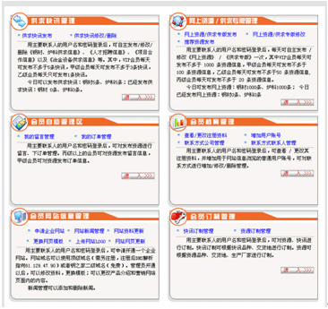 會(huì)員社區(qū)提供供求快訊管理、網(wǎng)上資源/供求專版管理、會(huì)員自助管理、會(huì)員檔案管理、會(huì)員網(wǎng)站信息管理、會(huì)員訂制管理,共6個(gè)欄目。