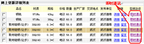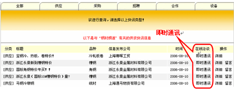 1、鋼之家網(wǎng)站在推薦資源、供求專版、供求快訊、網(wǎng)上資源、現(xiàn)貨銷售等版塊均設(shè)計(jì)了即時(shí)通訊按鈕。如圖1、圖2所示。