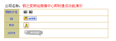 針對(duì)當(dāng)前比較流行的騰訊QQ、MSN、SKYPE等即時(shí)通訊軟件,并結(jié)合鋼之家網(wǎng)站鋼市沙龍的商務(wù)洽談功能,鋼之家網(wǎng)站商情中心隆重推出商情中心在線洽談即時(shí)通訊功能,方便供需雙方迅速建立聯(lián)系。