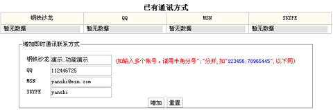 2、在增加即時(shí)通訊聯(lián)系方式中,根據(jù)您已使用的即時(shí)通訊軟件,在相應(yīng)的位置填寫聯(lián)系方式,填寫完成后,點(diǎn)增加按鈕。見圖7、圖8。添加完成后,也可對(duì)即時(shí)通訊聯(lián)系方式進(jìn)行修改和刪除。