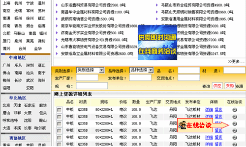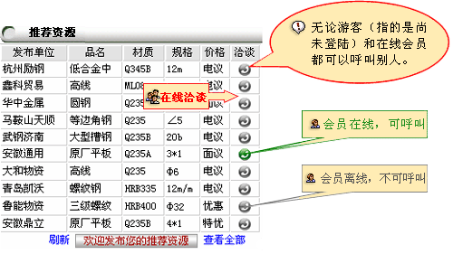 在推薦資源列表,供求快訊列表,資源列表的后列,有一洽談圖表,如果該會員在線,該圖表將為綠色 ,點擊就可以呼叫該會員。如會員不在線該圖標為灰色 ,則不能呼叫。如圖1、圖2、圖3所示: