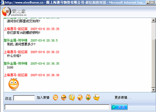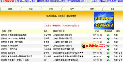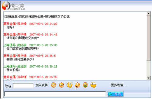 為了更快的連接供需雙方,使雙方的溝通更為方便,鋼之家網(wǎng)站自主開發(fā)了在線洽談功能,2007年3月1日在鋼之家網(wǎng)站的商情中心隆重推出。