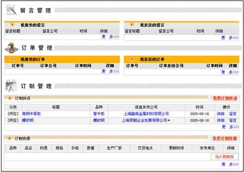 進(jìn)入“商情中心”首頁(yè),會(huì)員直接點(diǎn)擊“我的商務(wù)區(qū)”進(jìn)入管理區(qū),可以輕松的查看留言、訂單、訂制內(nèi)容。